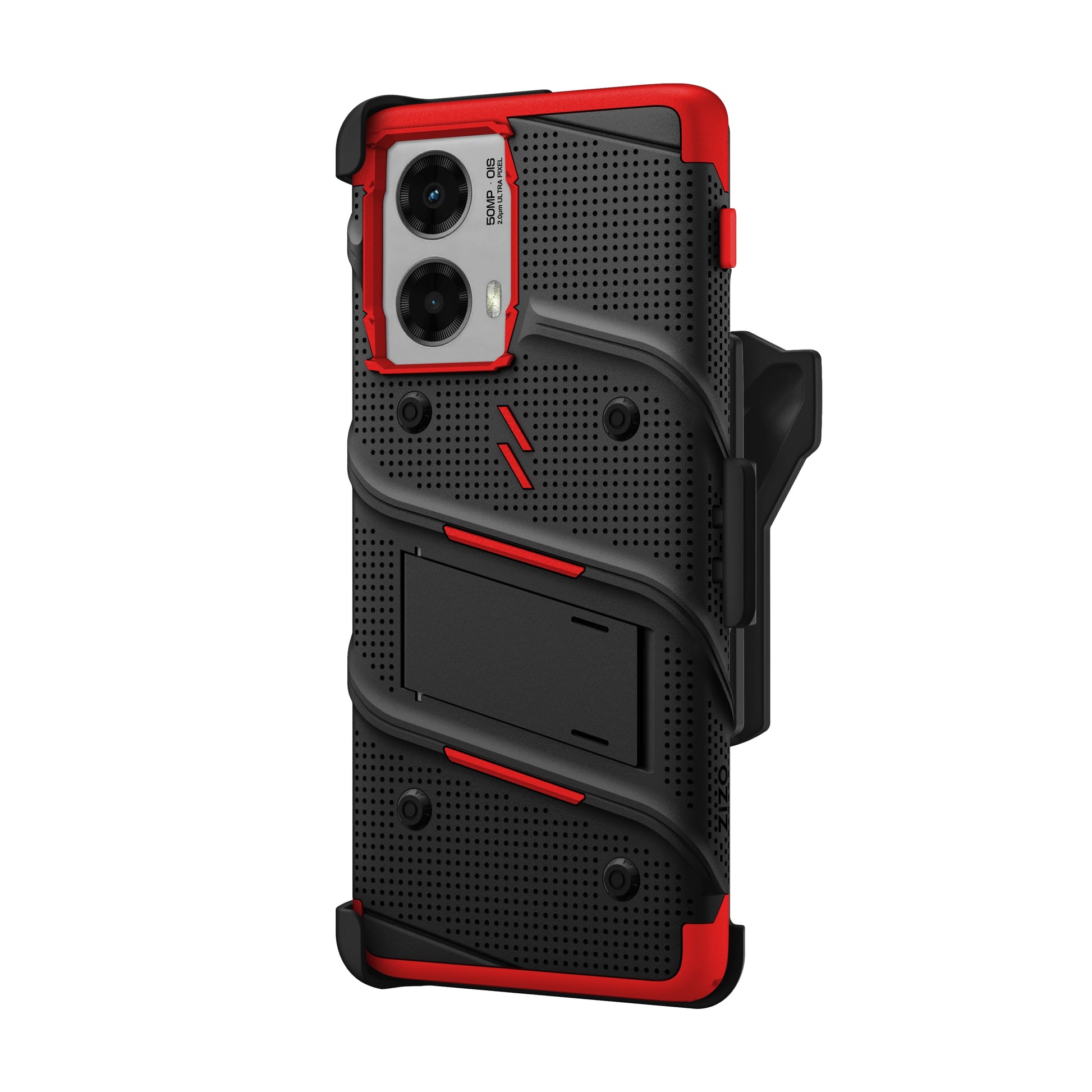 EngineeBlack / Red to protect against the unexpected. The ZIZO BOLT Series for moto edge 5G (2024) is specifically constructed to withstand the most intense drops while keeping your device safe and secure. With countless hours of development and rigorous lab testing, the BOLT has surpassed the industry standards to bring you the ultimate level of protection. The patented dual-layer design is made to protect your phone from all angles. The rugged outer shell guards the device surface, while the inner core shock-absorbing technology prevents internal damage. In other words: The BOLT can take a beating, without having to worry if your phone will survive. A complimentary ZIZO 0.33mm TempeBlack / Red Glass with 100% Clarity and 9H Hardness is included with each purchase. All of this in our signature ZIZO style. Keeping your phone functional, without all the extra bulk. The BOLT Series features a built-in kickstand, made to take your binge-watching experience to the next level. And with the included rotating belt-holster and lanyard, the ZIZO BOLT is ready to go wherever you are. This ZIZO BOLT case is designed for moto edge 5G (2024) PATENT NO: D795,239.