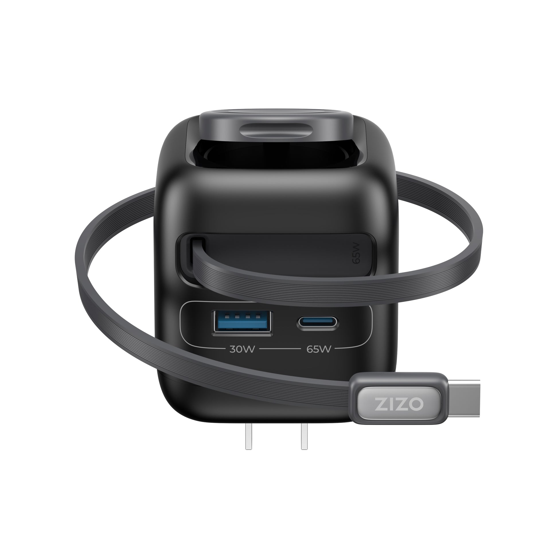 ZIZO PowerVault Cube 65W GaN Travel Charger with Smartwatch Dock, Retractable Cable, and Multi-Port Fast Charging - Space Black
