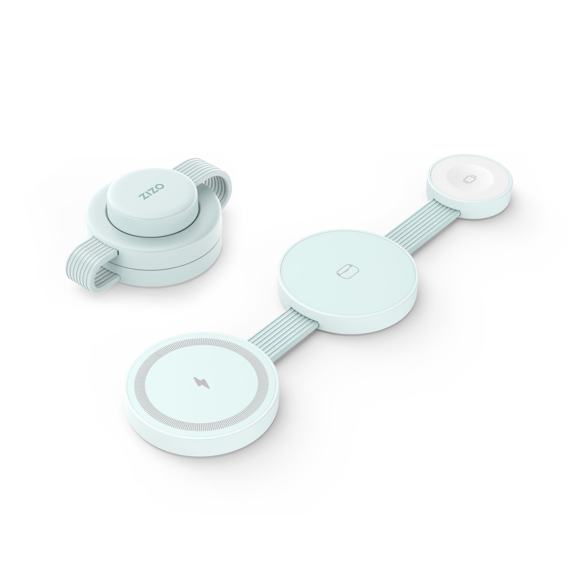 The ZIZO PowerVault Fold is your minimalist charging solution built for maximum mobility. This ultra-compact, 3-in-1 wireless charger delivers fast wireless power to your phone, earbuds, and smartwatch in a soft-silicone form that folds flat and fits in the palm of your hand. Perfect for travel or everyday use, it supports 15W fast charging and is powered via USB-C for reliable performance. With a soft-touch finish and modern pastel colors, it's both functional and stylish — designed to charge your essentials without adding bulk.